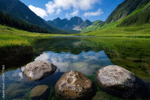 © VANATSANUN, Fototapeta premium A serene landscape featuring mountains reflected in tranquil waters surrounded by greenery.