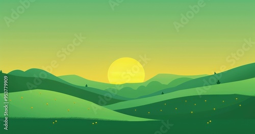 © BersyukurStock, Fototapeta premium A serene landscape featuring rolling green hills and a large yellow sun setting in the background, evoking tranquility.