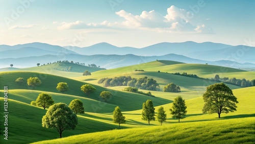 Fototapeta premium A serene landscape featuring rolling green hills and scattered trees under a...