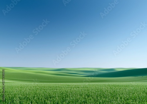 Naklejka premium A serene landscape featuring rolling green hills under a clear blue sky, evoking tranquility and natural beauty.
