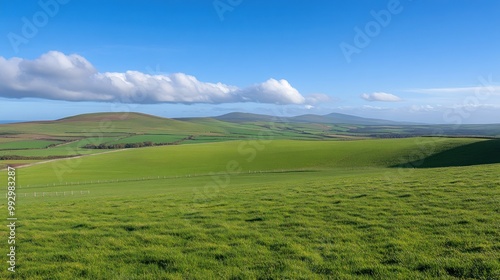 Fototapeta premium A serene landscape featuring rolling green hills under a clear blue sky with...
