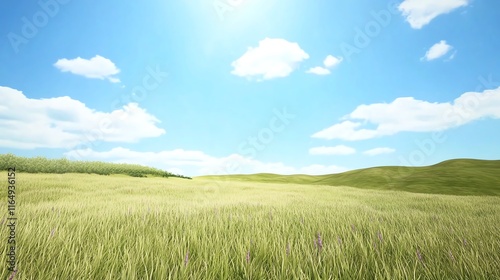 Obraz premium A serene landscape featuring rolling hills and a bright blue sky with fluffy...
