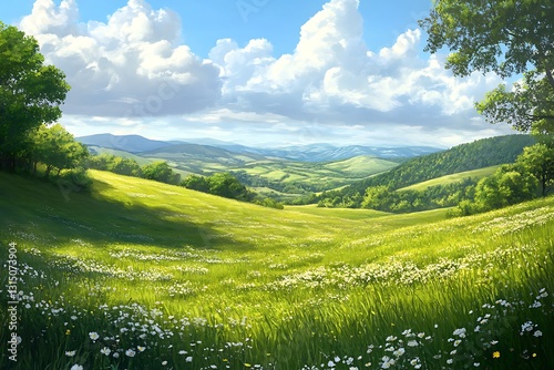 © akkun, Obraz premium A serene landscape featuring rolling hills, lush greenery, and a bright blue sky with clouds.