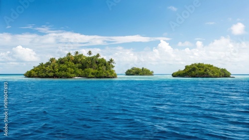 Obraz premium A serene landscape featuring small tropical islands surrounded by clear blue...