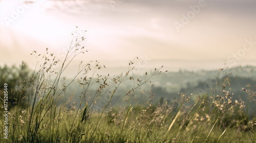 © morepiixel, Obraz premium A serene landscape featuring tall grass swaying gently in the breeze, illuminated by soft sunlight with distant hills in the background.
