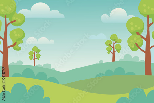 Obraz premium A serene landscape illustration depicts stylized trees and rolling green...