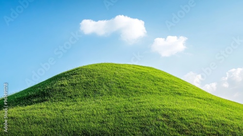© Naru, Fototapeta premium A serene landscape image showcasing a rolling green hilltop against a backdrop of a clear blue sky dotted with fluffy white clouds. The scene symbolizes tranquility, renewal, growth, and the beauty of