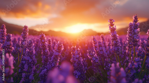 Naklejka premium A serene landscape of a vast lavender field at sunset, with rows of purple...