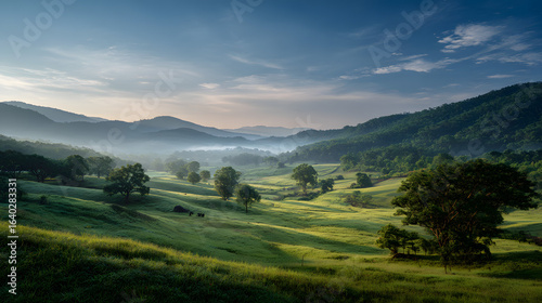 © Daniel, Obraz premium A serene landscape of rolling green fields under a bright blue sky at sunrise, surrounded by trees. This picturesque view embodies tranquility and the beauty of nature.