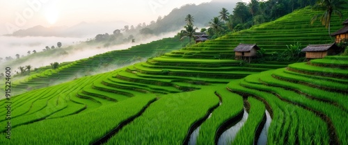 © sitifatimah, Fototapeta premium A serene landscape of terraced rice fields at sunrise, showcasing vibrant green crops and a peaceful rural atmosphere