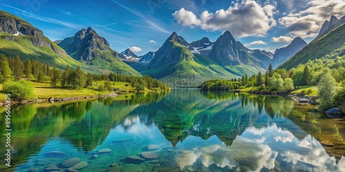 © Nasnunt, Naklejka premium A serene landscape of untouched nature in Norway with crystal clear lakes, lush green forests, and towering mountains