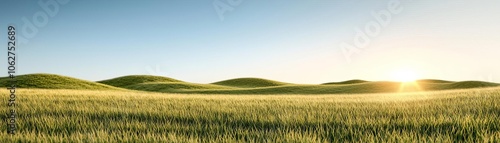 © lnwAI, Obraz premium A serene landscape showcasing rolling hills under a clear blue sky with the sun rising in the background, illuminating the grassy fields.