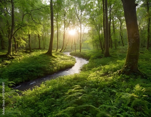 Fototapeta premium A serene landscape where a small river winds through a lush, green forest at...