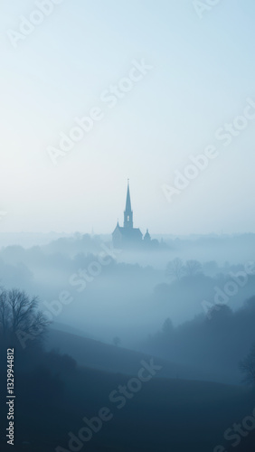© Tameem, Fototapeta premium A serene landscape with a church silhouetted against the foggy backdrop of hills.