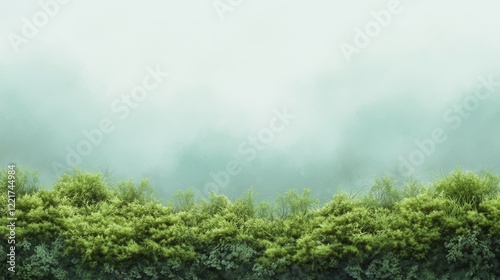 © Moon Guy, Obraz premium A serene landscape with a misty background and lush green foliage.