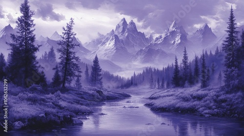 Fototapeta premium A serene landscape with a winding river flowing through a valley surrounded by snow-capped mountains and a misty forest.
