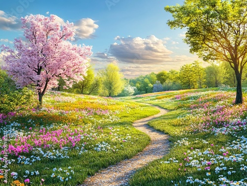 Naklejka premium A serene landscape with blooming trees and a winding path through colorful...