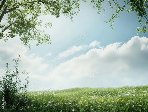 © Rekalawa, Fototapeta premium A serene landscape with green grass, flowers, and a clear blue sky.