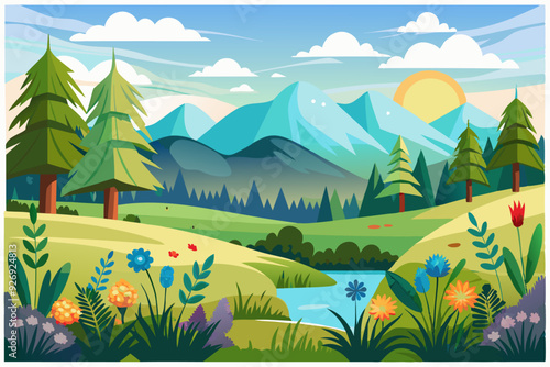 © Design Crea, Obraz premium A Serene Landscape with Mountains, Trees, Flowers, and a River