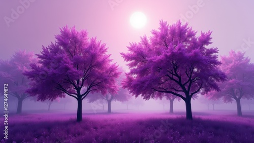 Obraz premium A serene landscape with purple trees under a bright sun, creating a mystical...