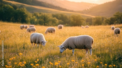 Fototapeta premium A serene landscape with sheep grazing in a sunlit field surrounded by wildflowers.