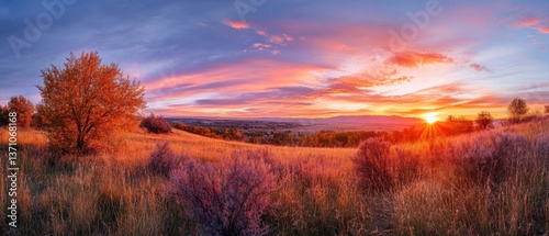 Fototapeta premium A serene landscape with the sun setting behind a field of tall grass, perfect for use in travel or nature-inspired designs