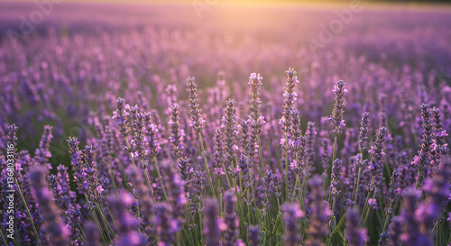 Naklejka premium A serene lavender field bathed in the golden light of sunset, a tranquil...
