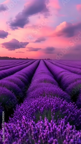 Naklejka premium A serene lavender field under the twilight sky, with rows of purple flowers stretching to the horizon. captures the tranquility and beauty of nature