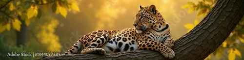 © Pawarit, Obraz premium A serene leopard resting on a branch in a lush, sunlit forest setting.