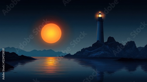 © darion, Fototapeta premium A serene lighthouse scene at sunset reflecting on calm waters.