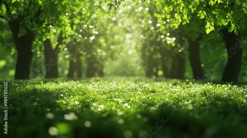 © Nathan, Obraz premium A serene, lush green forest scene with sunlight filtering through vibrant leaves, creating a tranquil atmosphere.