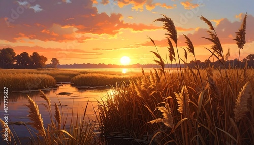Fototapeta premium A serene marsh landscape at sunset. Golden grasses sway gently in the breeze,...