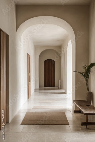 Fototapeta premium A serene, minimalist hallway featuring arched doorways, neutral tones, and...