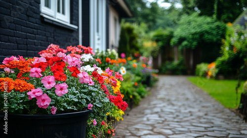 Fototapeta premium A serene minimalist house with a small, lush garden. The yard features colorful flowers and a stone path, offering a bright modern tone, with blurred space for captions on the side