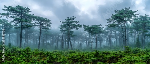 © AIGC JOE, Obraz premium A serene misty forest scene featuring tall pine trees enveloped in fog, conveying a tranquil and mysterious atmosphere amidst lush green undergrowth.