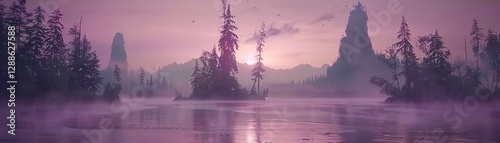 Naklejka premium A serene, misty landscape at dusk, featuring tall silhouettes of trees and mountains, enveloped in soft purple hues and reflected in the still water below.