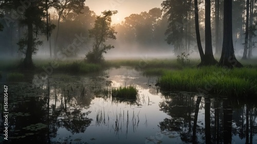 Fototapeta premium A serene misty landscape with reflections in a tranquil swamp at dawn.