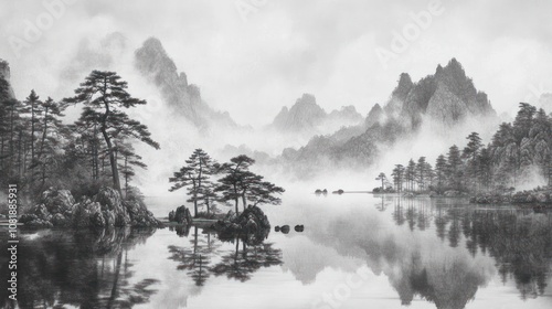 Fototapeta premium A serene, misty mountain lake with a small island and tall trees reflected in...