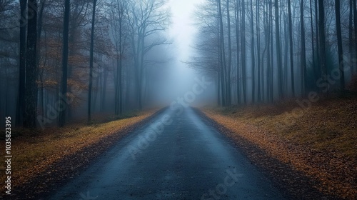© jirayut, Fototapeta premium A Serene Misty Road Cutting Through a Tranquil Forest, Embraced by Nature's Calm Fog