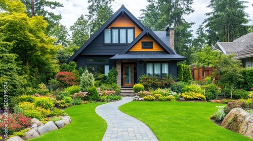 © Matcha_09, Fototapeta premium A serene modern garden house with a clean, angular design, surrounded by manicured lawns and natural stone paths