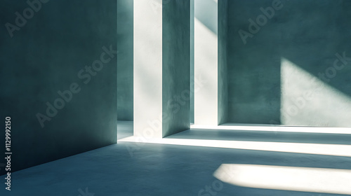 © Roy, Fototapeta premium A serene modern interior showcasing tall, minimalist columns bathed in soft sunlight, creating striking contrasts of light and shadow.
