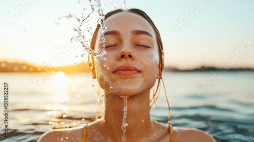 Obraz premium A serene moment captured as a woman enjoys water splashing on her face during sunset, evoking tranquility and bliss.