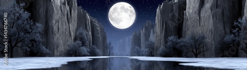 Naklejka premium A serene moonlit landscape with cliffs and a reflective water surface.