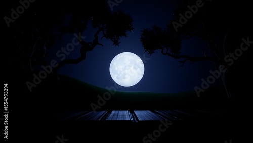 Naklejka premium A serene moonlit night scene featuring a bright full moon illuminating a dark landscape with silhouetted trees and a wooden platform below.