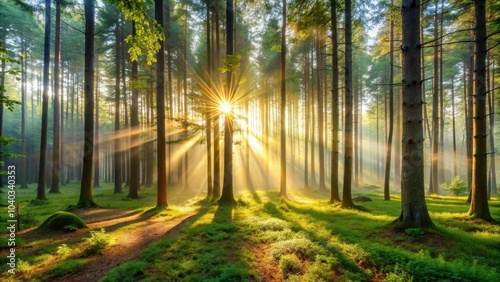 Fototapeta premium A serene morning in the forest with sunlight filtering through the trees , forest, nature, tranquil, peaceful, sunrise, trees