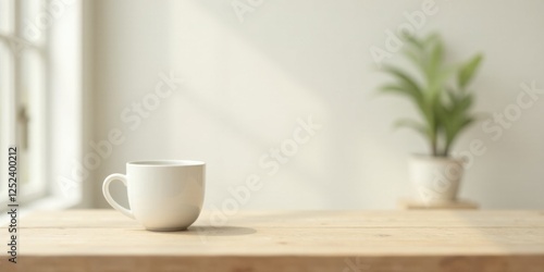 © vattana, Obraz premium A serene morning scene featuring a simple white mug on a light wood surface, bathed in soft sunlight, next to a blurred potted plant, conveying a sense of calm and tranquility.