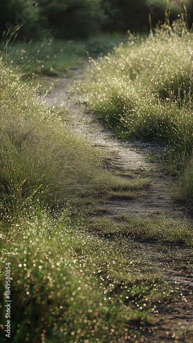Obraz premium A serene morning walk reveals a quiet path adorned with subtle dew and fresh...