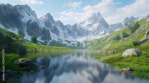 Naklejka premium A Serene Mountain Lake Reflecting Snow-Capped Peaks and a Partly Cloudy Sky, Framed by Lush Green Hills and Evergreen Trees, Creating a Peaceful and Natural Landscape.