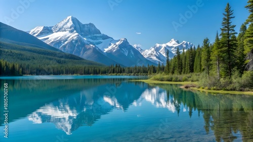 Naklejka premium A serene mountain lake reflecting snow capped peaks and lush evergreen forest under a clear blue sky