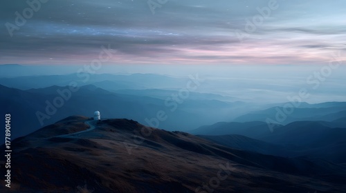 Fototapeta premium A serene mountain landscape at dawn or dusk with a remote observatory on a...